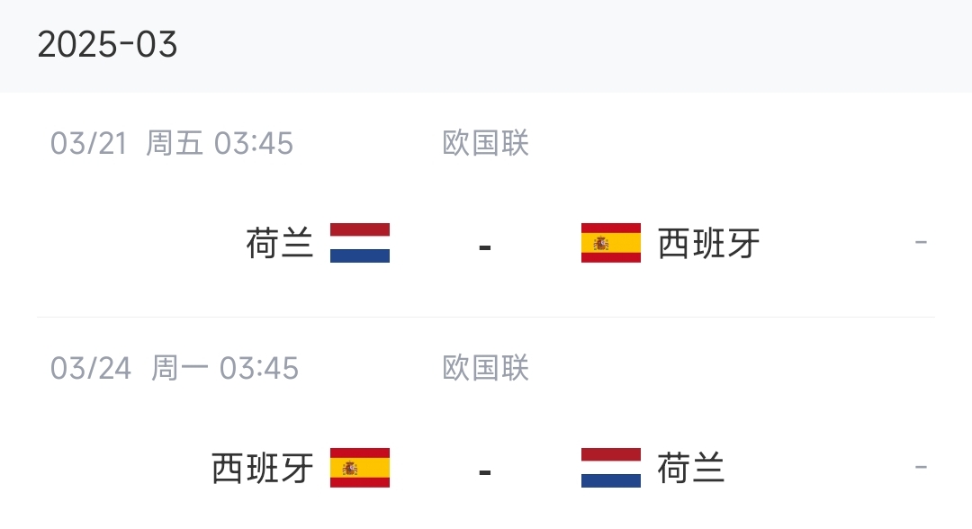 3月份國(guó)際比賽日中,西班牙將在歐國(guó)聯(lián)1/4決賽迎來(lái)與荷蘭隊(duì)的兩回合比賽,比賽時(shí)間為3月21日和3月24日,西班牙先客后主。